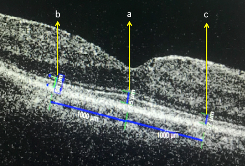 The entire macular area was scanned with an HDOCT instrument (Cirrus OCT; Carl Zeiss Meditec) with scan lengths of 9 mm for horizontal scans and 6 mm for vertical scans. High-quality images were obtained by using the five-line raster mode and en face analysis for IS-OS junctions. The distance between the inner border of the ELM and the ellipsoid zone (EZ),which had previously been called as the photoreceptor IS and OS junction line, was taken to be the IS thickness, and the distance between the EZ and the inner border of the retinal pigment epithelium (RPE) was taken to be the OS thickness. Photoreceptor thickness was taken from IS and OS thickness and measured in three locations : at foveola, 1000 µm nasal foveola (perifovea 1), and 1000 µm temporal foveola (perifovea 2). Central foveal thickness is distance from ILM to RPE thickness that was made on the OCT images passing through the fovea. This was made with the software of the system (Figure 1). Scans with a signal strength of >7/10 were considered appropriate, and a representative image was selected for the measurements.