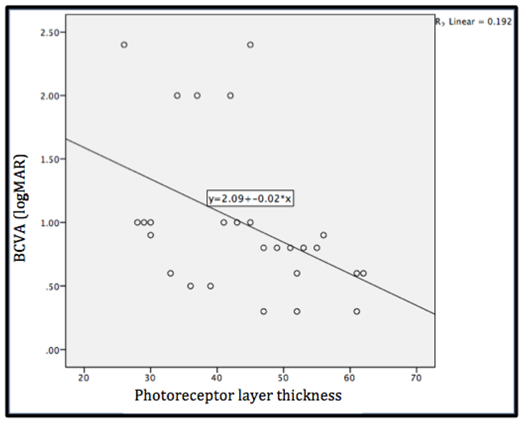 In our study, there was negative significant correlation between photoreceptor thickness with visual acuity (p value < 0.05) which means the thicker photoreceptor layer gives better visual acuity in logMAR shown in Figure 2, where best BCVA had lowest logMAR. Long term duration of detachment can cause photoreceptor apoptosis, and further it causes neurosensory thinning and dystrophy. The relatively thicker neurosensory of the foveal had a better BCVA compared to the thinner one. Hence, we might conclude that the thinner fovea with macular atrophy had a poor VA, while the thicker one had a better VA. The group with thicker fovea had better VA than the thinner one. Foveal thickness turned thin after retina recovery, it might be due to the cone/rod cell apoptosis. These changes were also detected by OCT.