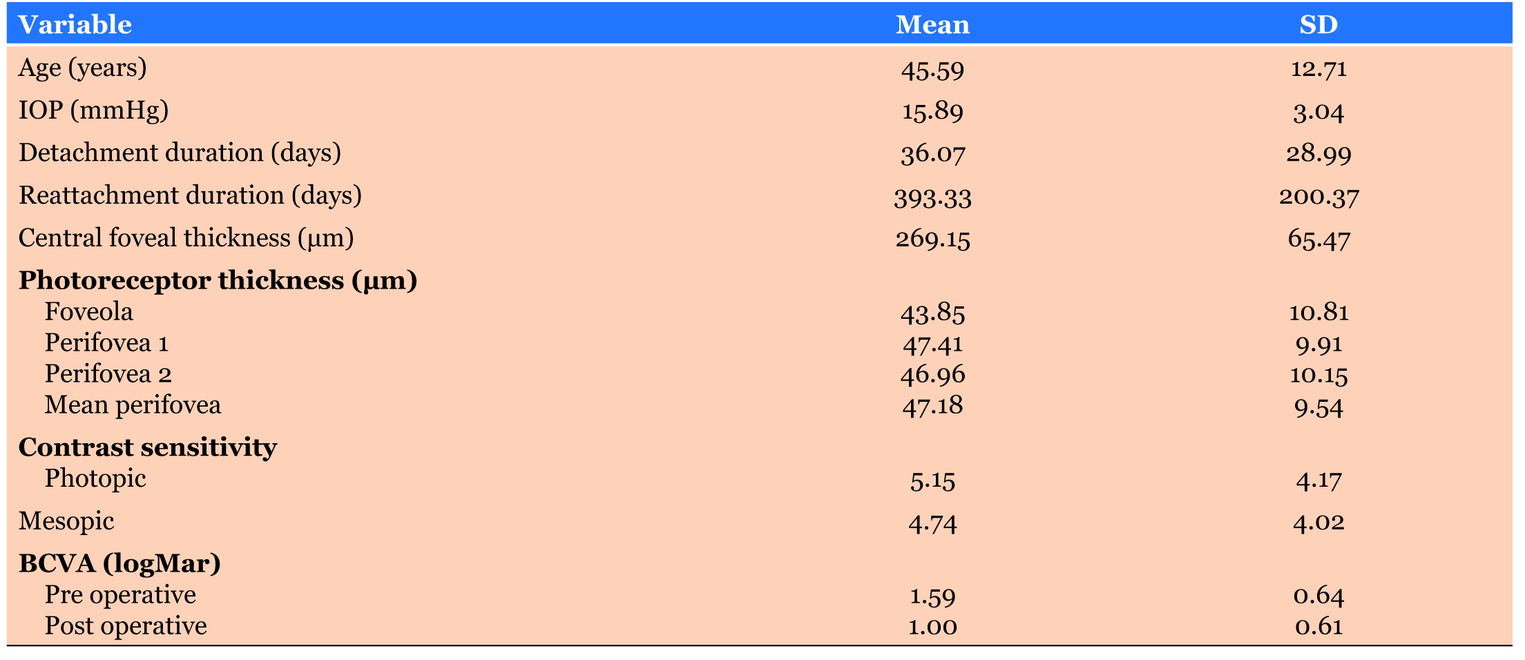 Characteristics of patients are shown in Table 1. Mean age was 45.59±12.71 years with duration of detachment 36.07±28.99 days. Best corrected visual acuity (BCVA) preoperative had logMAR mean 1.59±0.64 (range : 0.7- 2.7) and post-operative with logMAR mean 1.00±0.61 (range : 0.3-2.4). Central foveal thickness was 114–418 µm with mean photoreceptor thickness at foveola was 43.85±10.81µm