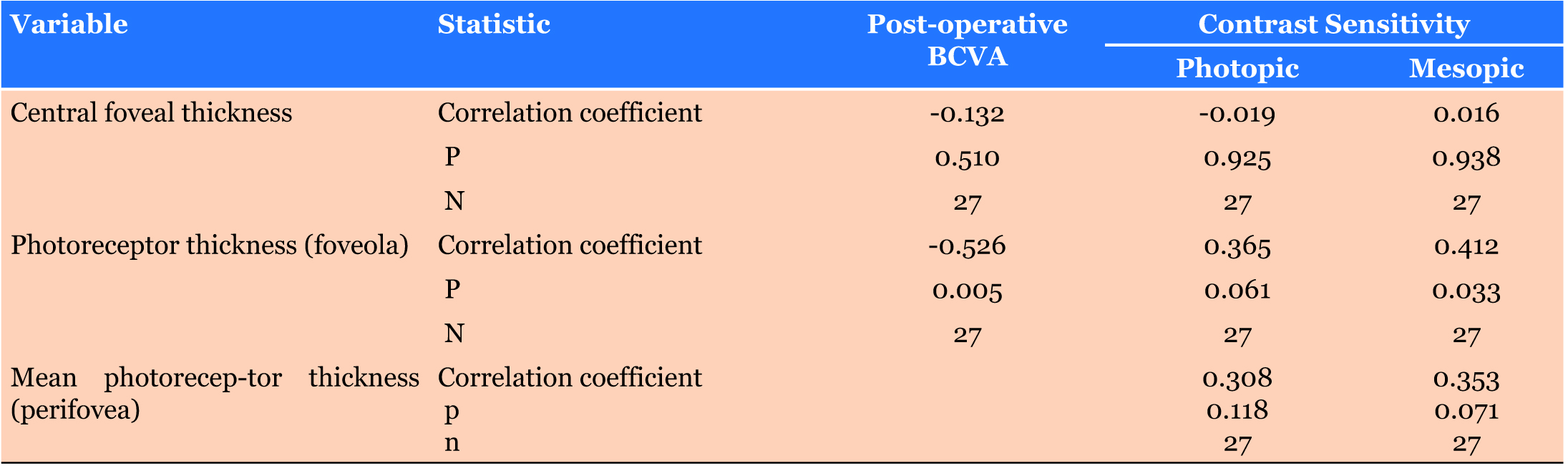 Conclusion: Photoreceptor layer thickness significantly correlated with visual acuity and contrast sensitivity in mesopic illumination, whereas thicker the photoreceptor, better the visual acuity and mesopic contrast sensitivity.