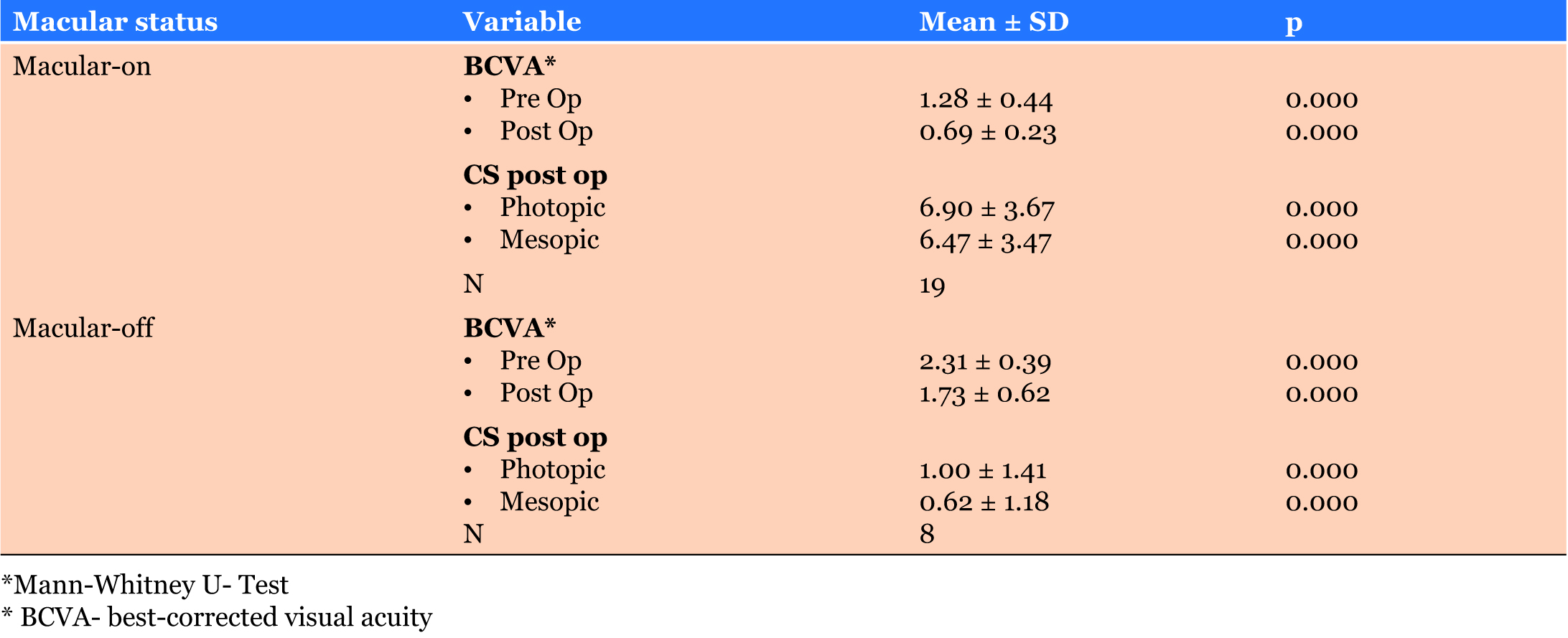Visual acuity and contrast sensitivity in photopic and mesopic condition with macular on history of RRD better than macular off with p value 0.00 in this study. Okamoto et al. demonstrated that CS decreased significantly after surgery for macular-on RRD without postoperative complications and abnormal OCT findings. Collectively, these findings indicate that surgical stress could cause a reduction in postoperative CS [22]. However, in our study, the difference in CS was between the macular-on and the macular-off group, possibly suggesting that reduced CS is due rather to foveal detachment than to surgical stress.